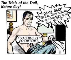 Mark Trail has been taking a bite out of crime — pet-nappers, to be specific! Andy has been his ally in the fight, and their plan has worked perfectly as Andy’s radio transmitter leads Mark to the villains! Mark’s punchin’ skillz are preceded by his formerly unknown kickin’ skillz! Don’t let those “gay chicken legs” (from CC’s Mautha) fool you!
