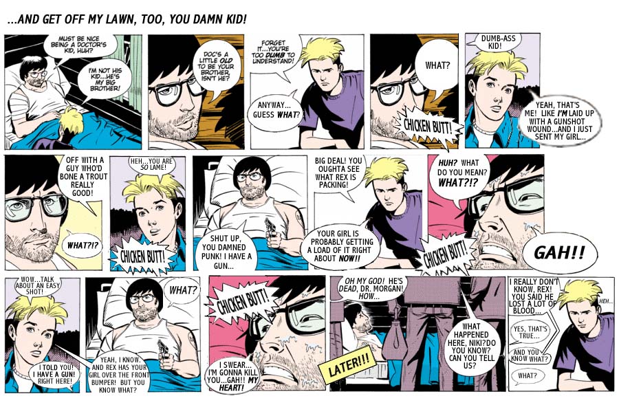 And suddenly, a pleasant weekend fishing for a Big and Little Brother turns into a brutal fight for survival with a blood-thirsty criminal and his deadly moll! Well, Lee is pretty intimidating for a guy in a tank top and his arm in a sling.