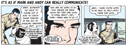 All right, so using Andy to find petnappers might be a good idea instead of the usual far-fetched one. It just seems that Andy lingers in the background, forgotten (if you can forget a 150-lb. dog) until the 15-watt bulb comes on over Mark’s head. I guess that’s the fate of just about every sidekick, human, animal or superhero.